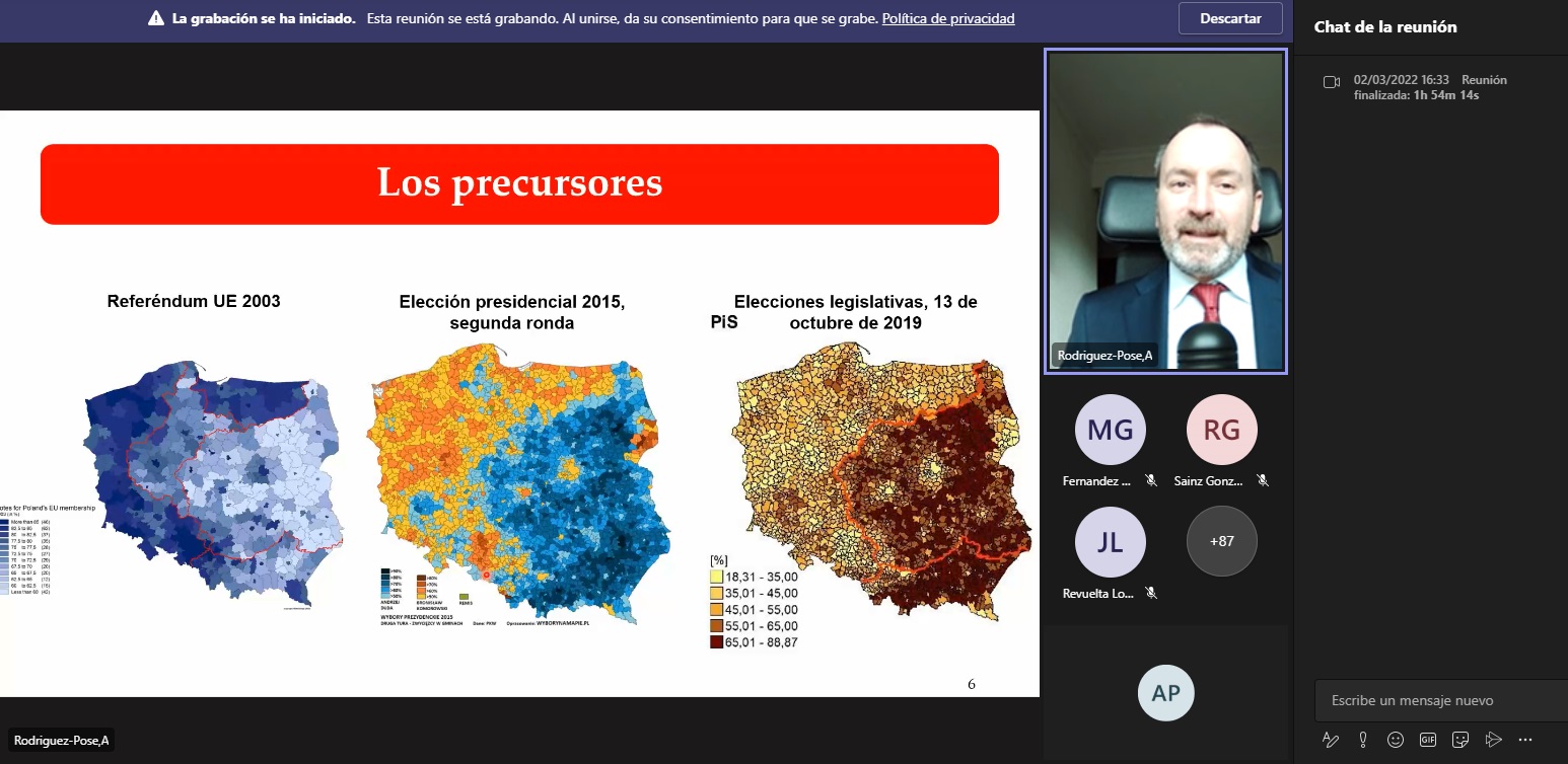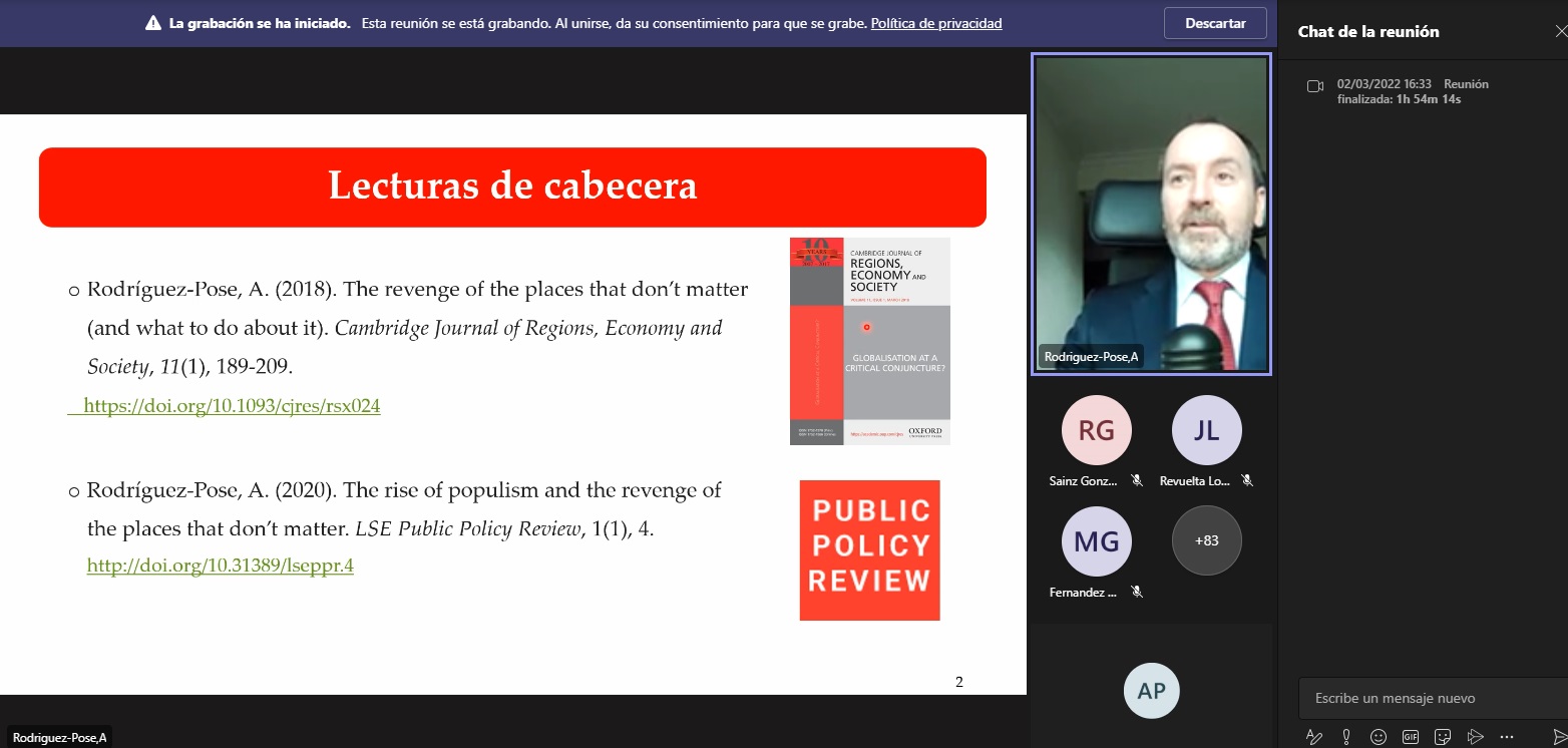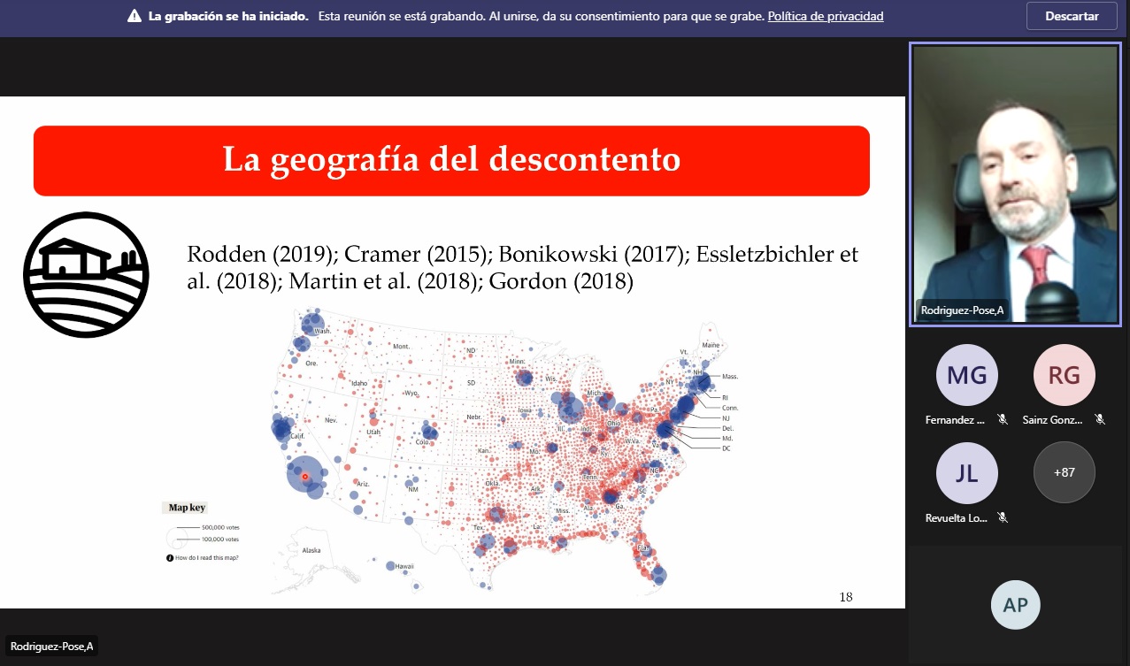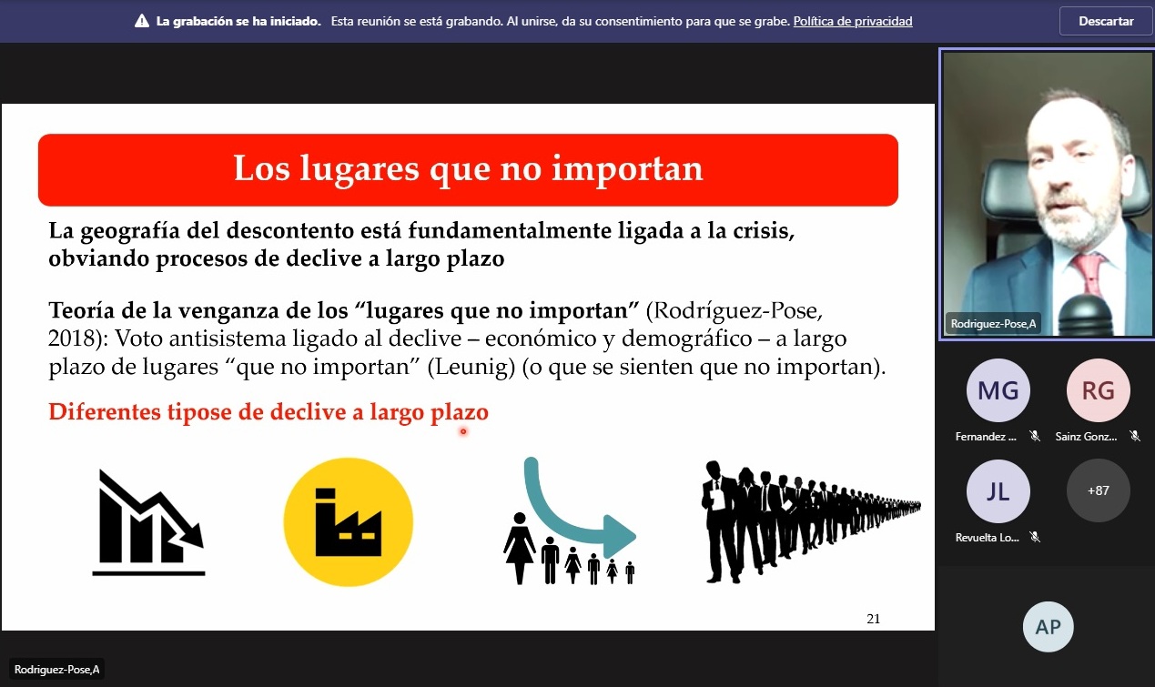 Durante la ponencia el Profesor Andrés Rodríguez-Pose presentó parte de su investigación, publicada en revistas de alto impacto internacional. En concreto, la ponencia abordó la creciente brecha territorial y la conexión que existe con el descontento de algunos grupos de población. Tras obviarse procesos de declive a largo plazo, parece que existe un voto antisistema ligado a dicho declive (económico y demográfico) de «lugares que no importan» (o que sienten que no importan). El profesor Rodríguez-Pose destaca que los lugares que «no importan», «sí importan». Lo que necesitamos es una política mejor.