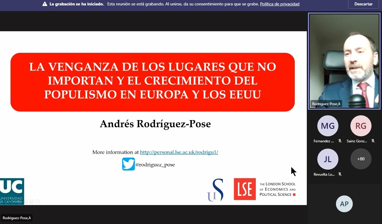 El lunes 7 de marzo a las 16.00h se celebró la Ponencia Especial Jean Monnet impartida por el Profesor Andrés Rodríguez-Pose (London School of Economics), con el título “La venganza de los lugares que no importan y el crecimiento del populismo en Europa y los EEUU”. El evento fue organizado por el Módulo Jean Monnet en Sistema Económico y Financiero y Desarrollo Regional (EUFIREG) de la Universidad de Cantabria y tuvo un gran éxito, con más de 100 asistentes.