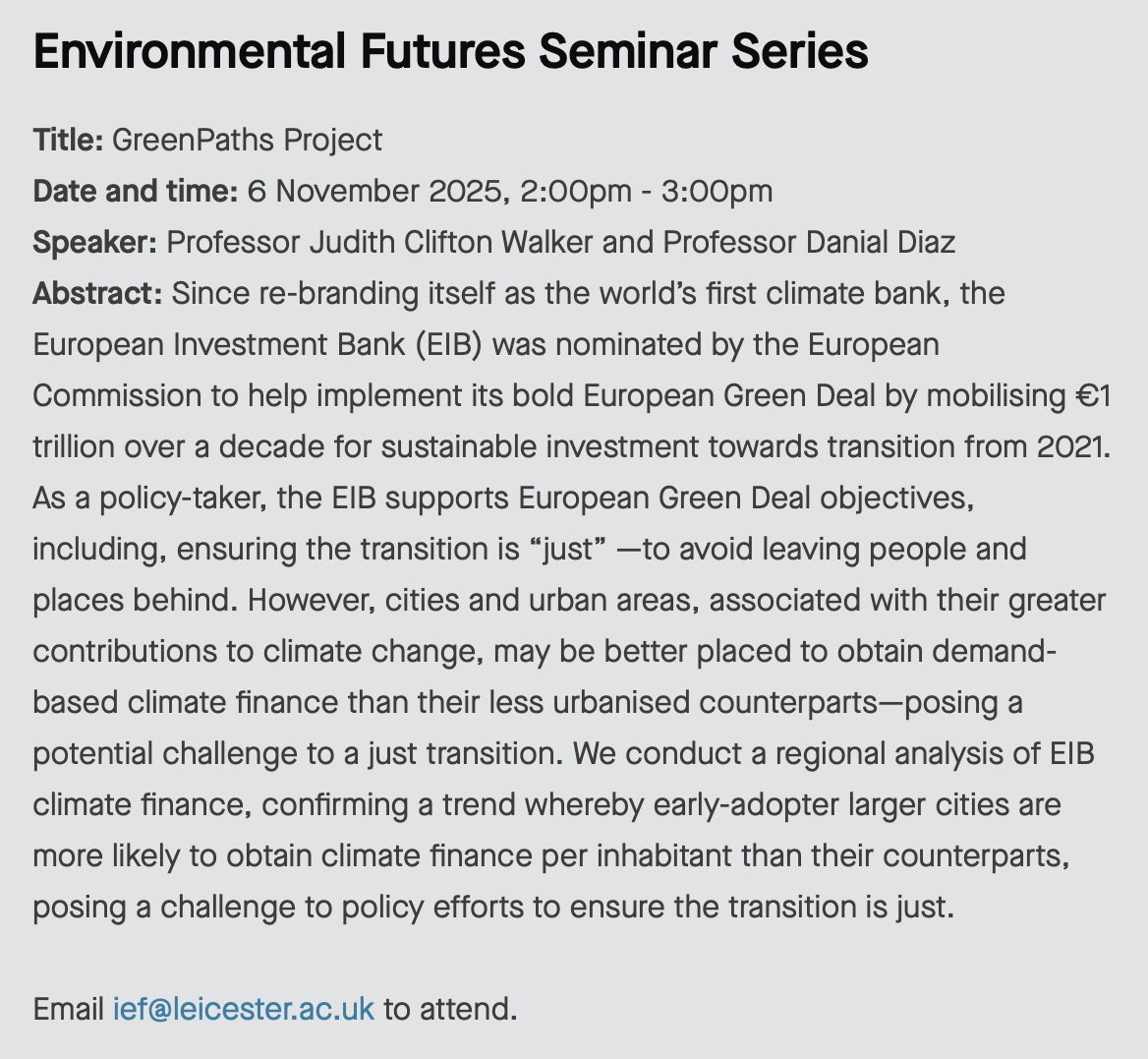 El pasado 6 de noviembre de 2025, el equipo del proyecto GreenPaths participó en el ciclo Environmental Futures Seminar Series organizado por el Institute for Environmental Futures (IEF) de la Universidad de Leicester (Reino Unido).