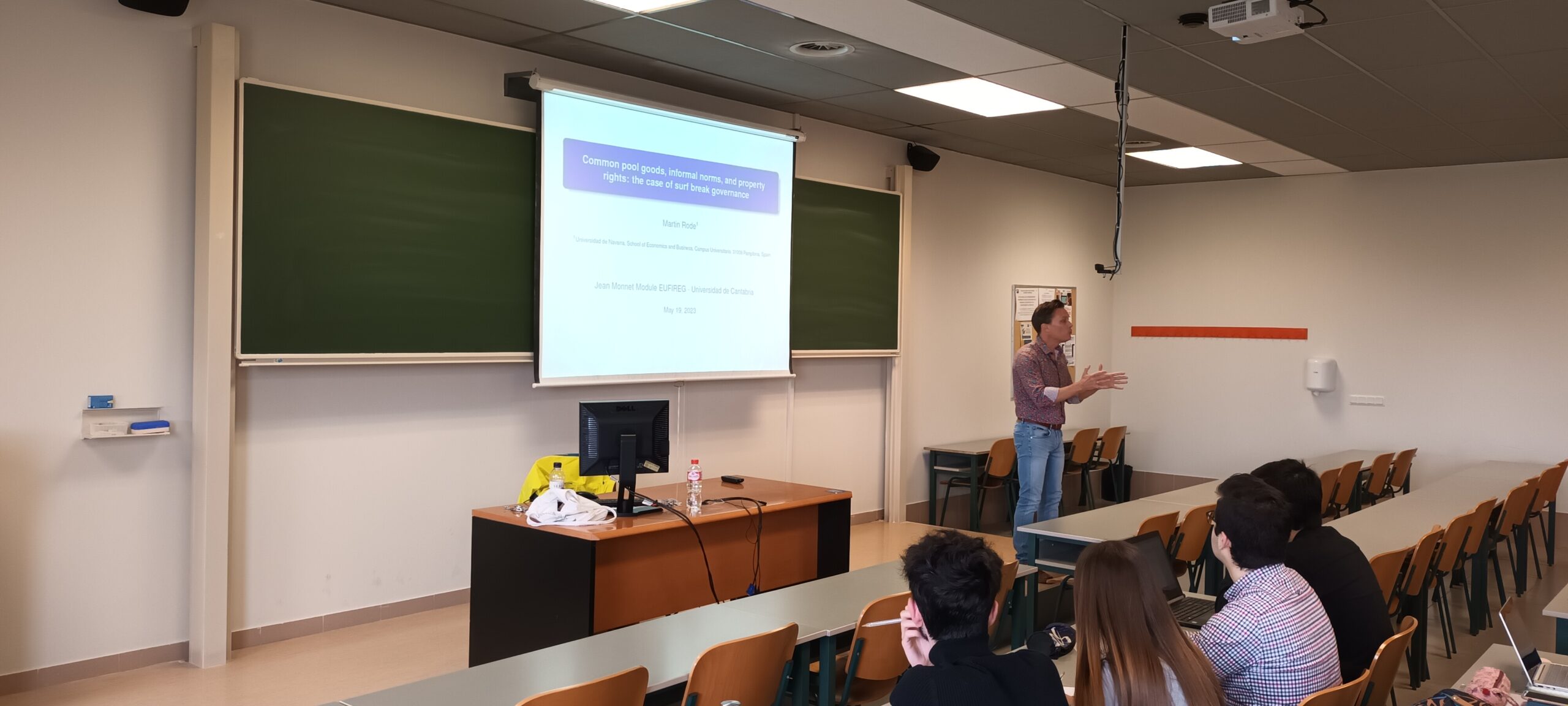 El viernes 19 de mayo a las 9:15h, el profesor Martin Rode (Universidad de Navarra) impartió el seminario “Recursos comunes, leyes informales y derechos de propiedad: el caso de la gobernanza del surf” a los estudiantes de Sistema Económico y Financiero, como parte de las actividades del Módulo Jean Monnet.
